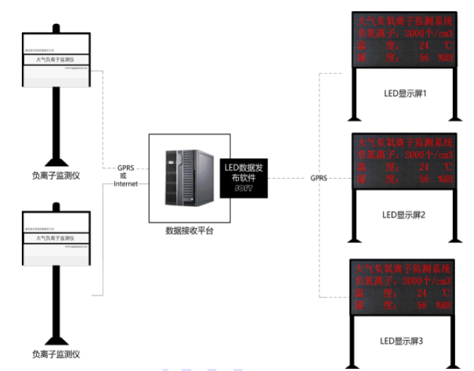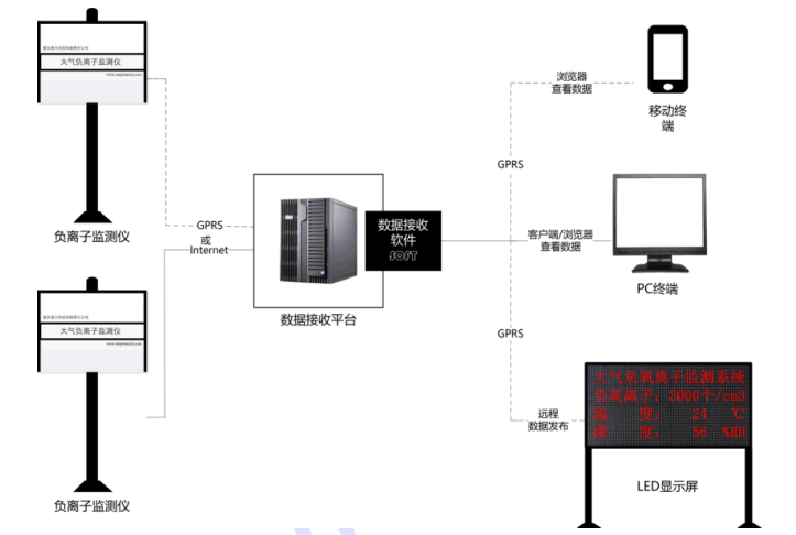 大氣負(fù)(氧)離子監(jiān)測(cè)儀將監(jiān)測(cè)到的負(fù)氧離子濃度、顆粒物、溫濕度數(shù)據(jù),通過(guò)GPRS傳輸網(wǎng)絡(luò)經(jīng)過(guò)Internet發(fā)送到接收數(shù)據(jù)的服務(wù)器上,并且自動(dòng)將數(shù)據(jù)保存并寫入數(shù)據(jù)庫(kù),客戶端可以通過(guò)瀏覽器查看數(shù)據(jù)等。用戶可以通過(guò)接收軟件和短信控制的方式監(jiān)控負(fù)氧離子監(jiān)測(cè)儀設(shè)備。以下是系統(tǒng)傳輸示意圖: