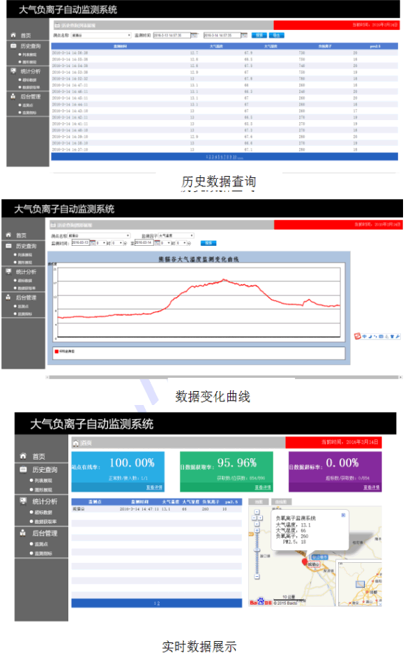 大氣負(fù)(氧)離子監(jiān)測(cè)系統(tǒng)WEB主頁(yè)發(fā)布及查詢軟件有著實(shí)用性強(qiáng),易操作,數(shù)據(jù)實(shí)時(shí)性強(qiáng)等優(yōu)點(diǎn)。具備多種對(duì)比方式查詢,具有良好的數(shù)據(jù)對(duì)比效果。主要分兩大塊:資料查詢和系統(tǒng)管理。