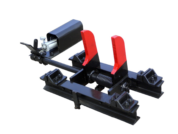 本實(shí)用新型公開(kāi)了一種氣動(dòng)阻車器,包括刀擋、扭簧、力把、氣缸、軸架、軸、限位板和拉桿,軸架固定在限位板上,軸的遠(yuǎn)端穿過(guò)扭簧鉸接在軸架上,刀擋固定在軸上并與扭簧上端連接,扭簧下端固定在拉桿上,力把下端固定在軸的近端,力把上端與氣缸鉸接。該氣動(dòng)阻車器結(jié)構(gòu)簡(jiǎn)單,安全可靠,可以人工控制,也可以遠(yuǎn)程控制,實(shí)現(xiàn)集中自動(dòng)化管理。